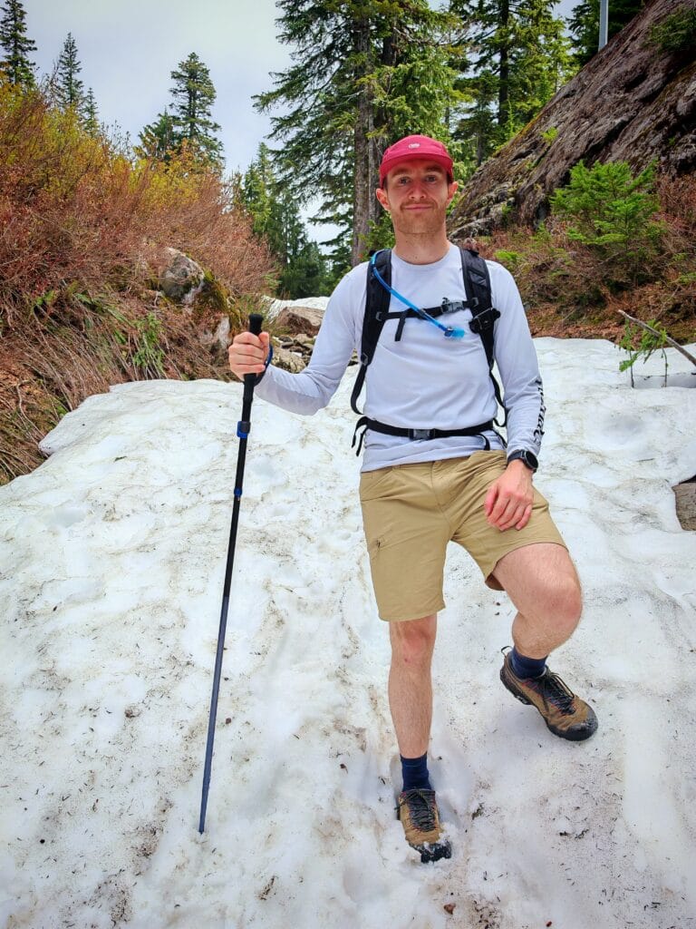 I was first impressed with how lightweight they are and how easy to fit into my Osprey Hikelite 18. The grip was lightly cushioned, and the strap didn’t itch or rub against my wrist despite not being a soft material. I fully appreciated these when backpacking and carrying a fully loaded Osprey Atmos 50 with my tent and camping gear inside. When climbing up to backcountry campsites and descending the next day, the Distance FLZ poles gave great support on rocky terrain and confidence to keep my balance. The Black Diamond Poles are soon to be added to an updated Hiking Packing List!